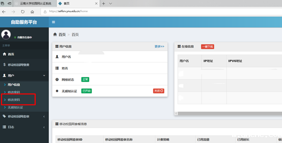 1.用户自主修改:登录上网认证的自服务系统,选择左边菜单的“用户”选项,点击出现下拉菜单,选择“修改资料”选项,在此页面填写有效的手机号码,并确认。
