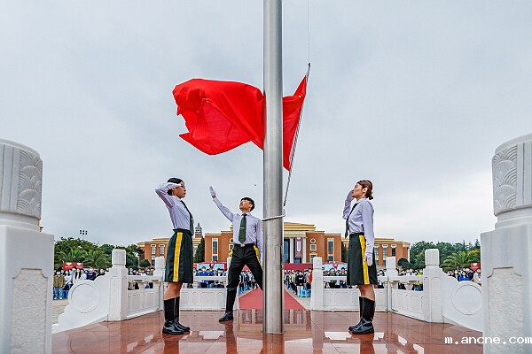 上午9时许,开学典礼在庄严的升旗仪式中拉开帷幕,学生国旗护卫队迈着铿锵有力的步伐,护卫着五星红旗,昂首阔步走向升旗台。在庄严雄壮的国歌声中,五星红旗冉冉升起,现场全体师生庄严肃立,向国旗行注目礼。