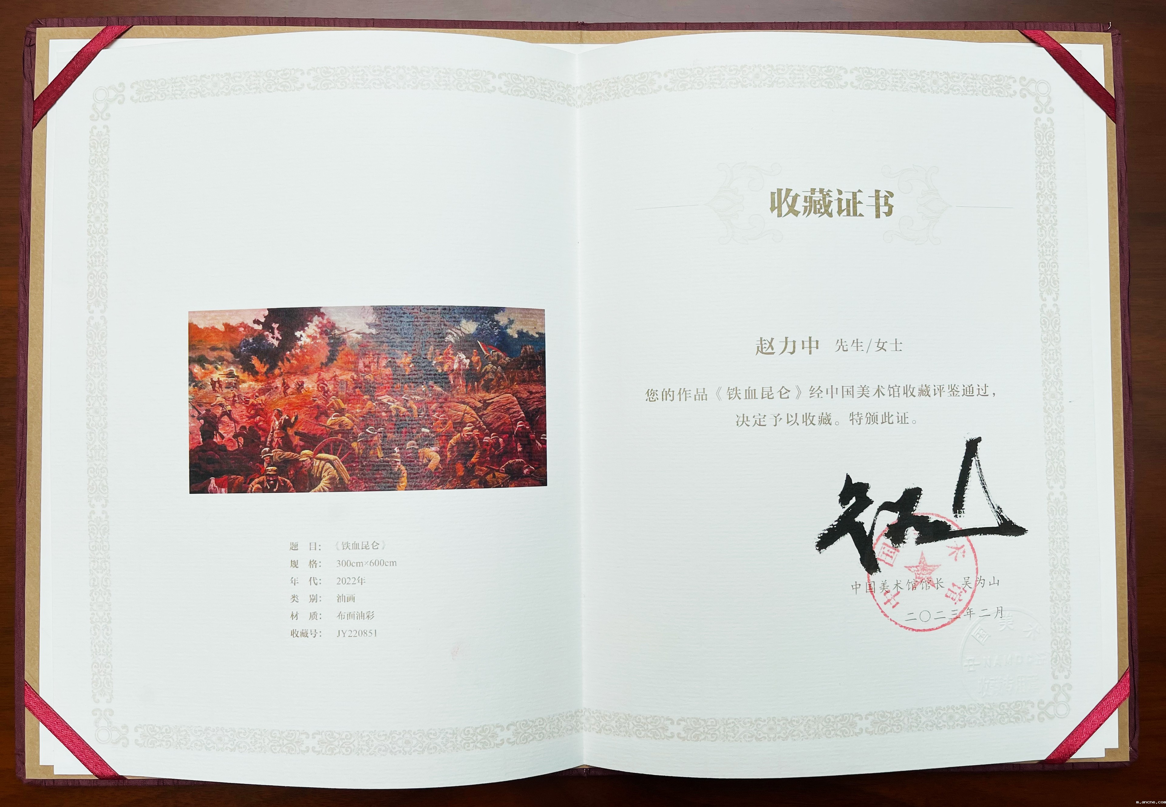 吴为山为赵力中颁发了中国美术馆捐赠收藏证书,并介绍说,该作品的入藏经过了专家委员会的严格评审,填补了中国美术馆关于昆仑关大捷题材藏品的空白,增加了馆藏的丰富性。