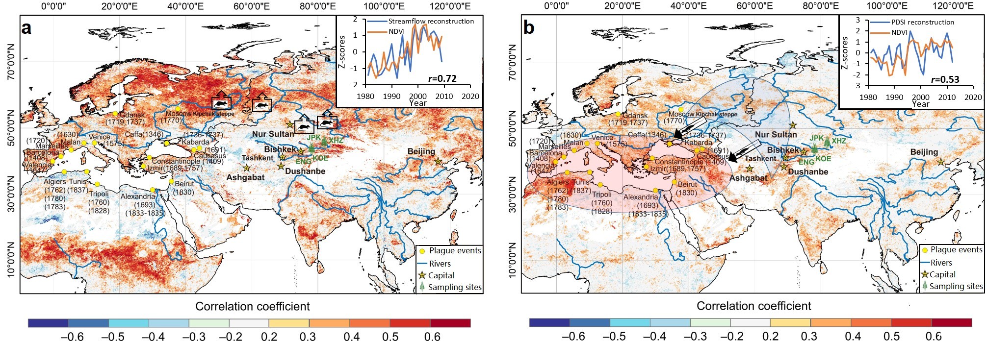 该研究基于天山山区雪岭云杉树轮资料重建了过去785年锡尔河、楚河、伊犁河和精河径流量变化。重建结果揭示了过去8个世纪以来中亚地区径流量变化的社会和生态影响,特别相对湿润的高径流时段,有利于绿洲和草原生产力的提高,使得欧亚内陆的草原帝国得以迅速崛起并迅速扩张(图1)。此外,我们表明中亚地区径流量变化对于欧亚大陆黑死病传播可能具有重要作用,并给出了水文气候变化背景下的欧亚大陆植被生产力时空变化对欧亚大陆黑死病传播影响的机制解释(图2)。该径流量重建序列为中亚地区水资源管理提供了长期的背景数据,将为准确评估中亚的气候水文变化提供重要科学依据。该研究成果以自然地理学为基础,结合人文地理学和历史地理学相关学科,为科学认识自然环境变化对过去千年欧亚大陆社会历史进展的影响提供了证据。该研究得到了国家重点研发计划(2018YFA0606401)和国家自然科学基金(U1803341和32061123008)资助。