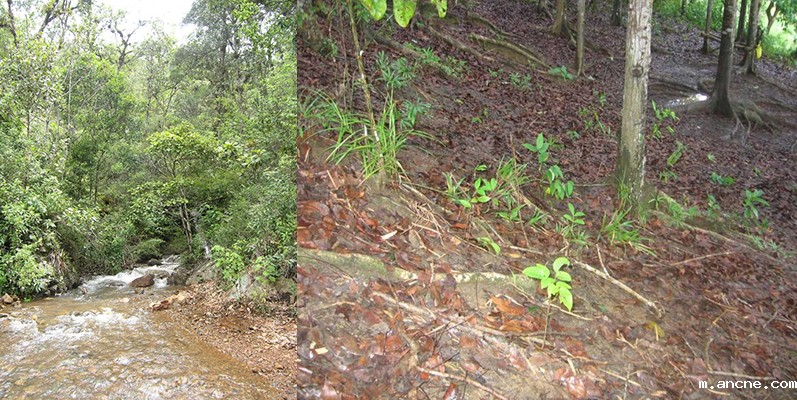 图1.A发育良好的天然林提供优质水源;B.菲律宾桃花心木人工林对土壤侵蚀的保护有限。