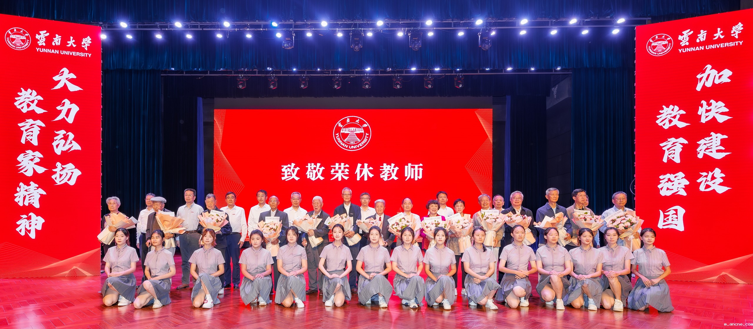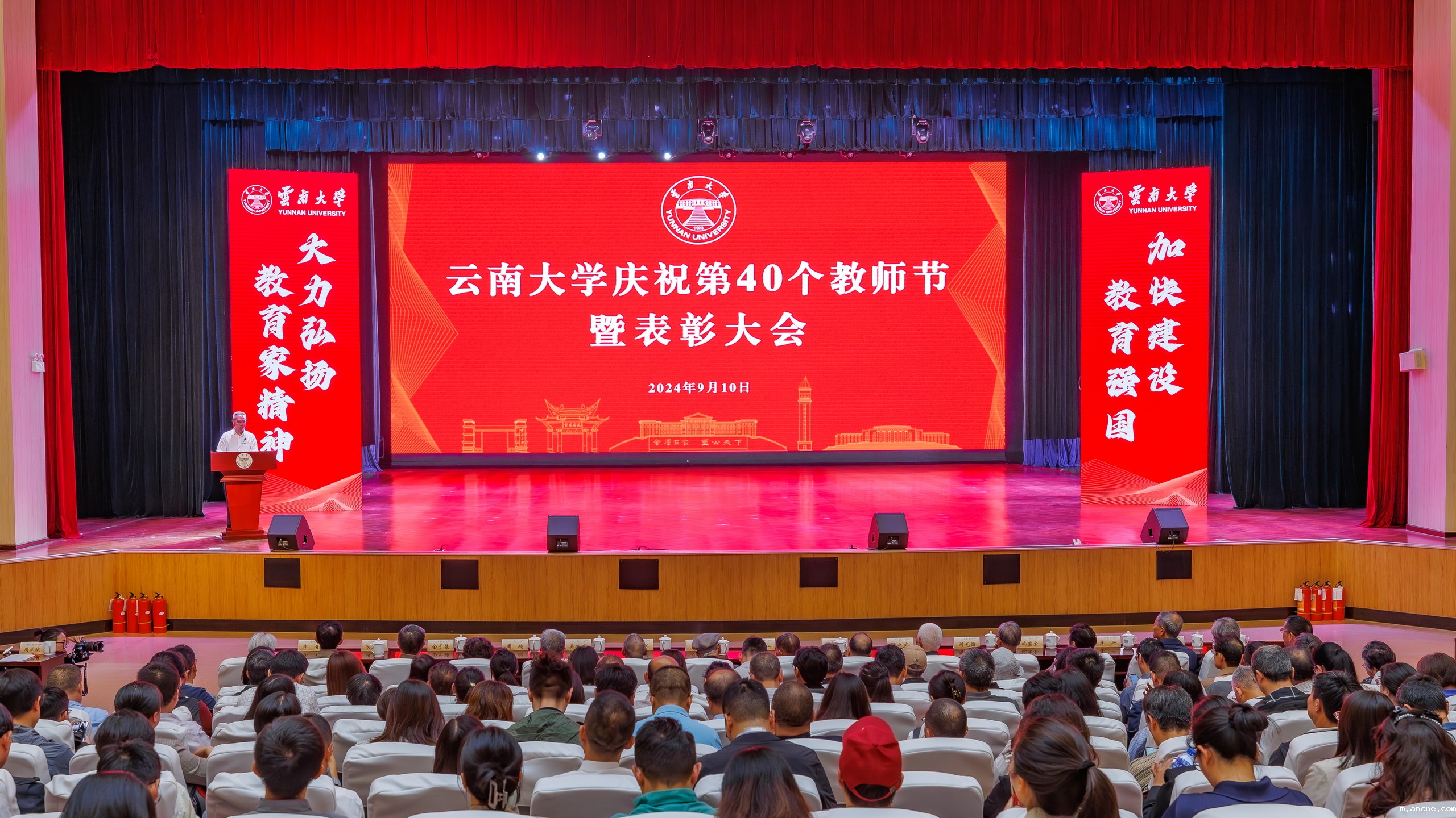 王学仁、林超民、游庆章、李平、马啸原、何正芳、吴兴惠、周鸿、沈紫金、金子强、张国庆、李青、段炳昌等老领导、老教师代表,“岳虹最美教师奖”“红云园丁奖”获奖团队和教师,校领导周学斌、马文会、张玮、吴建德、陈克清、廖炼忠、吴涧、段兴武、唐年胜,红云红河集团群团工作部部长江波,全校在职副处级以上干部,以及教师代表、学生代表1200余人齐聚一堂,共同庆祝第40个教师节。