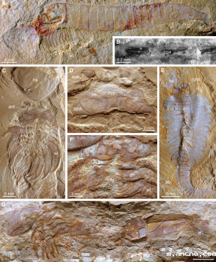 图版说明:昆明寒武纪小石坝化石库的抚仙湖虫类。A-D, Chengjiangocaris kunmingensis: A, B, 保存有腹神经索(深浅色相间链条状结构)和纤细的外缘神经(pn);C, D, 密集的附肢,蝶形口板及食物沟。E, Fuxianhuia xiaoshibaensis具铰连背甲及残留的特化触角后附肢(SPAs)。F, G, Alacaris mirabilis显示头部由口板、膨大特化的附肢基节组合形成的口器。