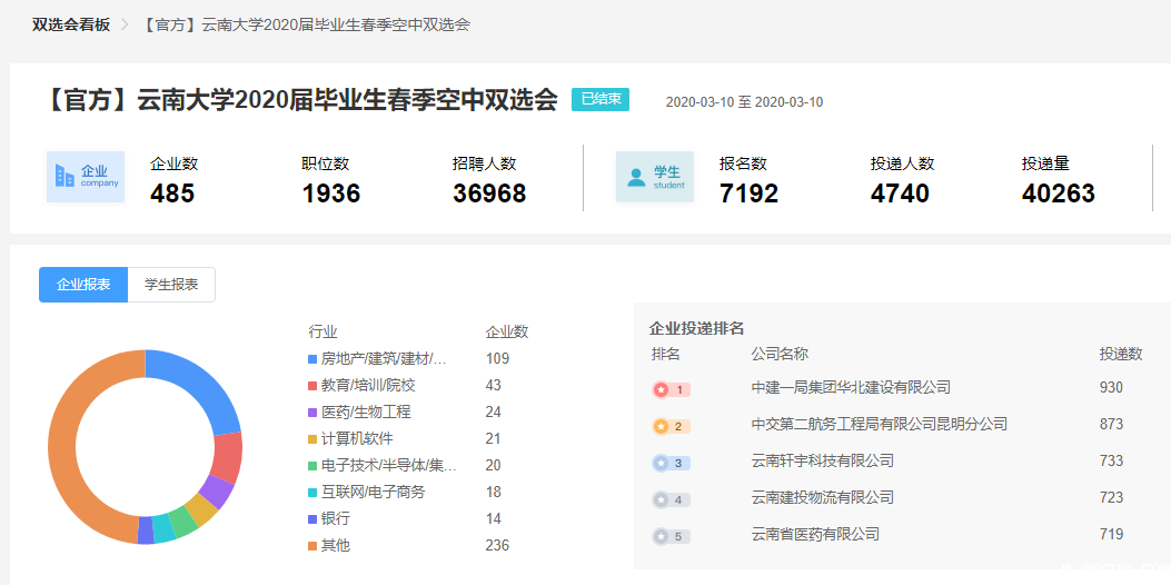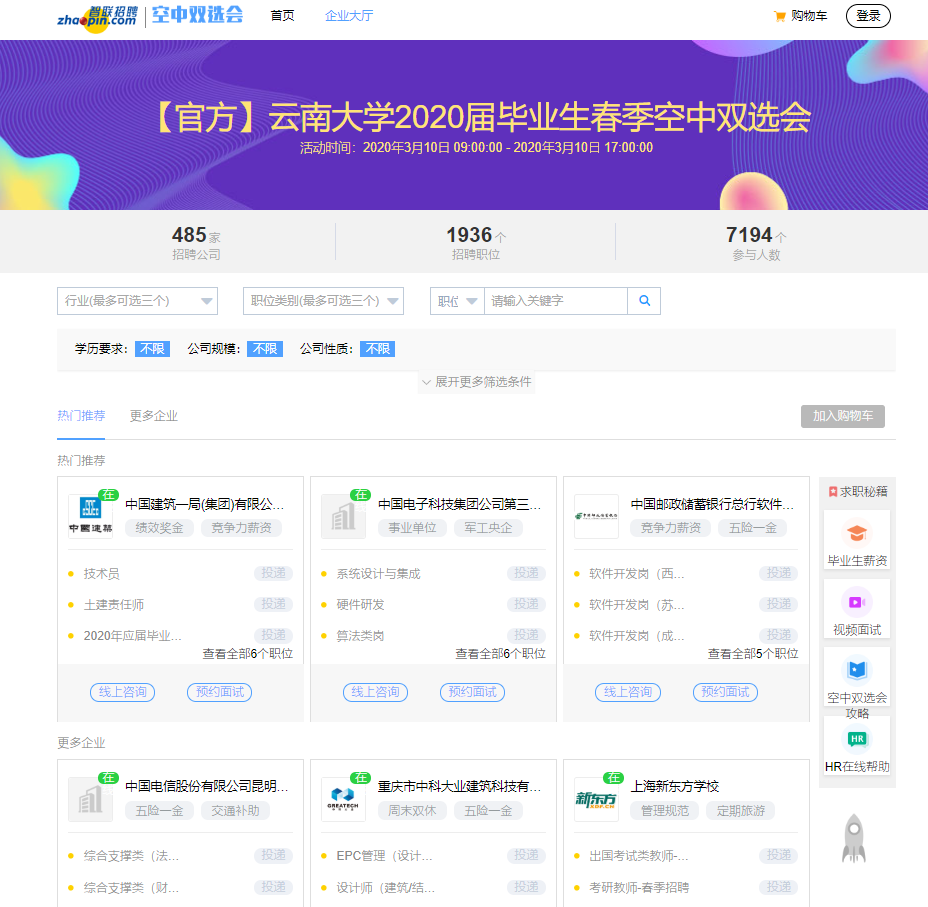 为深入贯彻习近平总书记在统筹推进新冠肺炎疫情防控和经济社会发展工作部署会议上的重要讲话精神,认真落实教育部、人社部指示要求和云南省有关工作安排,3月10日,米兰国际官网首场“2020届毕业生春季网络双选会” 顺利举办。