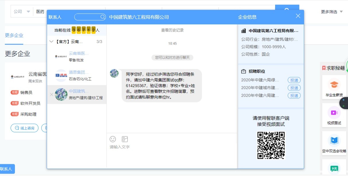 当天的双选会,广大毕业生通过网络积极与用人单位的招聘人员进行线上交流,全场共投递简历4万余份。大量企业正在进行简历筛选,部分完成简历初选、视频面试环节的企业,已初步与毕业生达成就业意向,后续将进行签约洽谈。