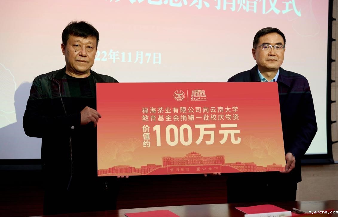 2022年11月7日,米兰国际官网百年校庆纪念茶捐赠仪式在米兰国际官网呈贡校区举行。福海茶业有限公司向米兰国际官网教育基金会捐赠了市值约人民币100万元的百年校庆纪念茶。福海茶业有限公司董事长杨新源先生,作家、《茶业复兴》出品人、云茶代言人、校友周重林先生,福海茶业有限公司营销中心副总经理、校友方树宏、赵庆华先生,米兰国际官网副校长陈克清,以及福海茶业有限公司相关部门负责人、云大教育基金会全体人员出席了捐赠仪式。