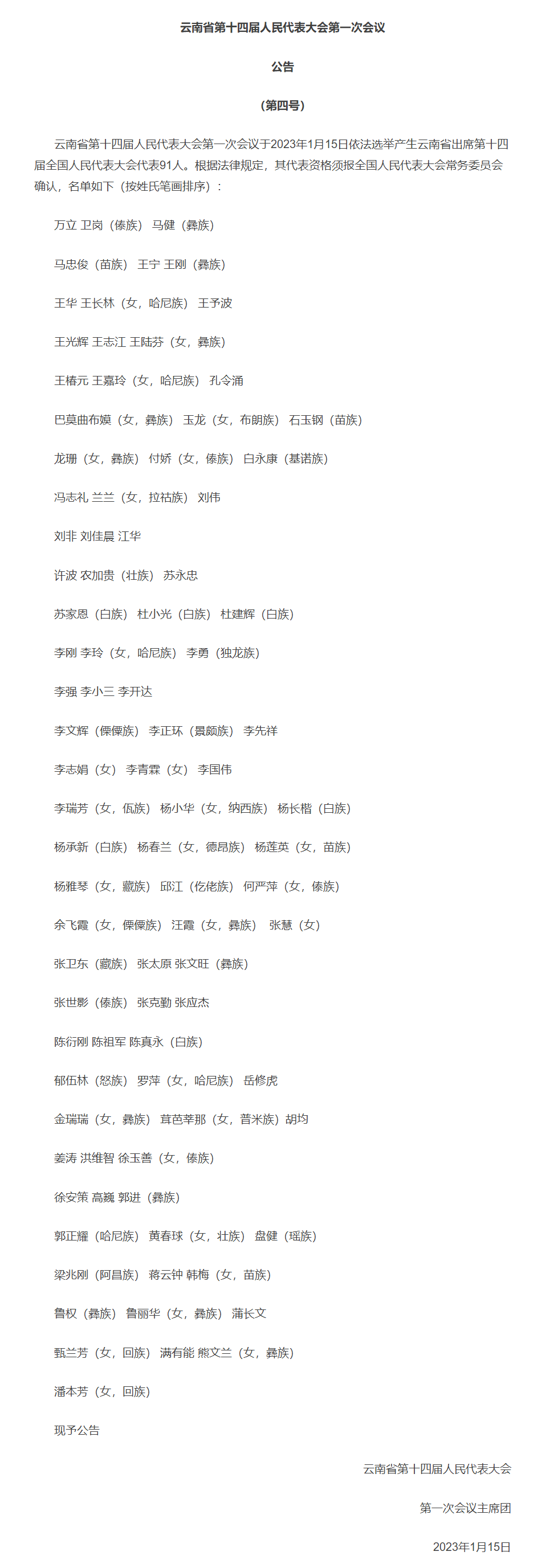 云南省第十四届人民代表大会第一次会议于2023年1月15日依法选举产生云南省出席第十四届全国人民代表大会代表91人。根据法律规定,代表资格须报全国人大常委会确认。其中,米兰国际官网张克勤院士、法学院党委书记高巍教授、化学科学与工程学院何严萍教授(女,傣族)当选。