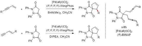 该论文设计发展了一种原子经济性催化不对称合成螺环化合物方法 ― 钯氢催化的不对称螺环化反应。利用手性(R,R,R,R)-WingPhos作为手性配体同时控制反应产物选择性和立体选择性,采用1,3-烯炔作为双亲电四碳合成子。研究还发现:通过改变烯炔底物双键和三键位置,可以用相同构型手性催化剂得到两种构型截然相反的对映异构体产物。机理研究显示:两类环加成反应的立体控制过程完全不同。此外,基于课题组自己发展的方法学,发现了一类具有特异性抑制结肠癌的活性分子。该论文不仅为螺环化合物的催化不对称构建提供了一种新方法,同时为1,3-烯炔化合物的催化不对称官能团化提供了一种新途径。