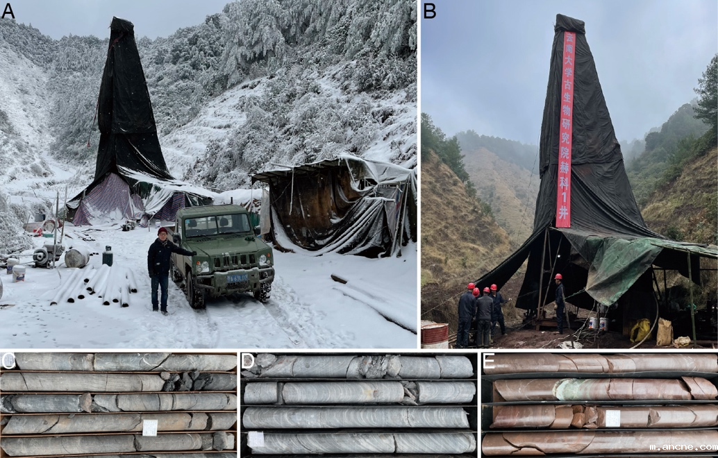 图2.冷清沟剖面岩芯钻探现场(2020年12月至2021年1月)(A和B,陈剑波副研究员在现场指导钻探和岩芯编录工作;C—E,岩芯照片)