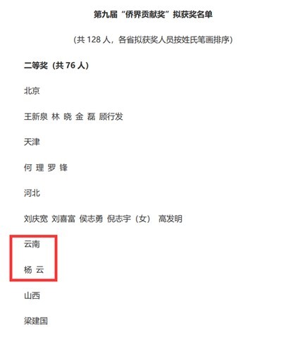 本届“中国侨界贡献奖”全国共表彰128名获奖者,其中一等奖52名,二等奖76名,杨云教授为本次云南省唯一获奖者。