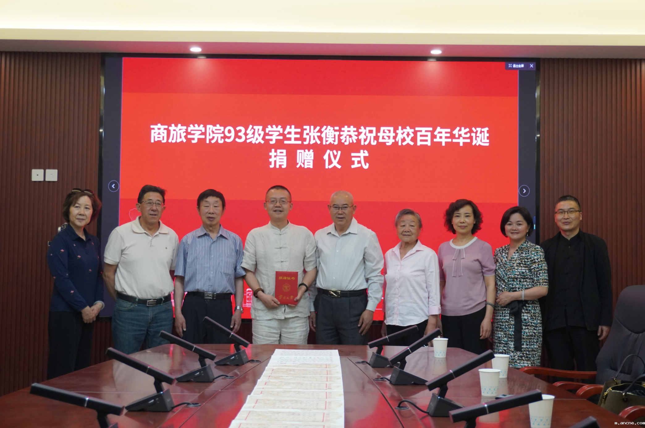 商旅学院党委书记张建良、档案馆·党史校史研究室副主任雷文彬向张衡对学校、学院的关心和帮助表示感谢,向张衡授予了捐赠证书并进行合影留念。捐赠仪式后,张衡、袁天慈、袁东一行参观了学校校史馆,了解学校的建设和发展情况。