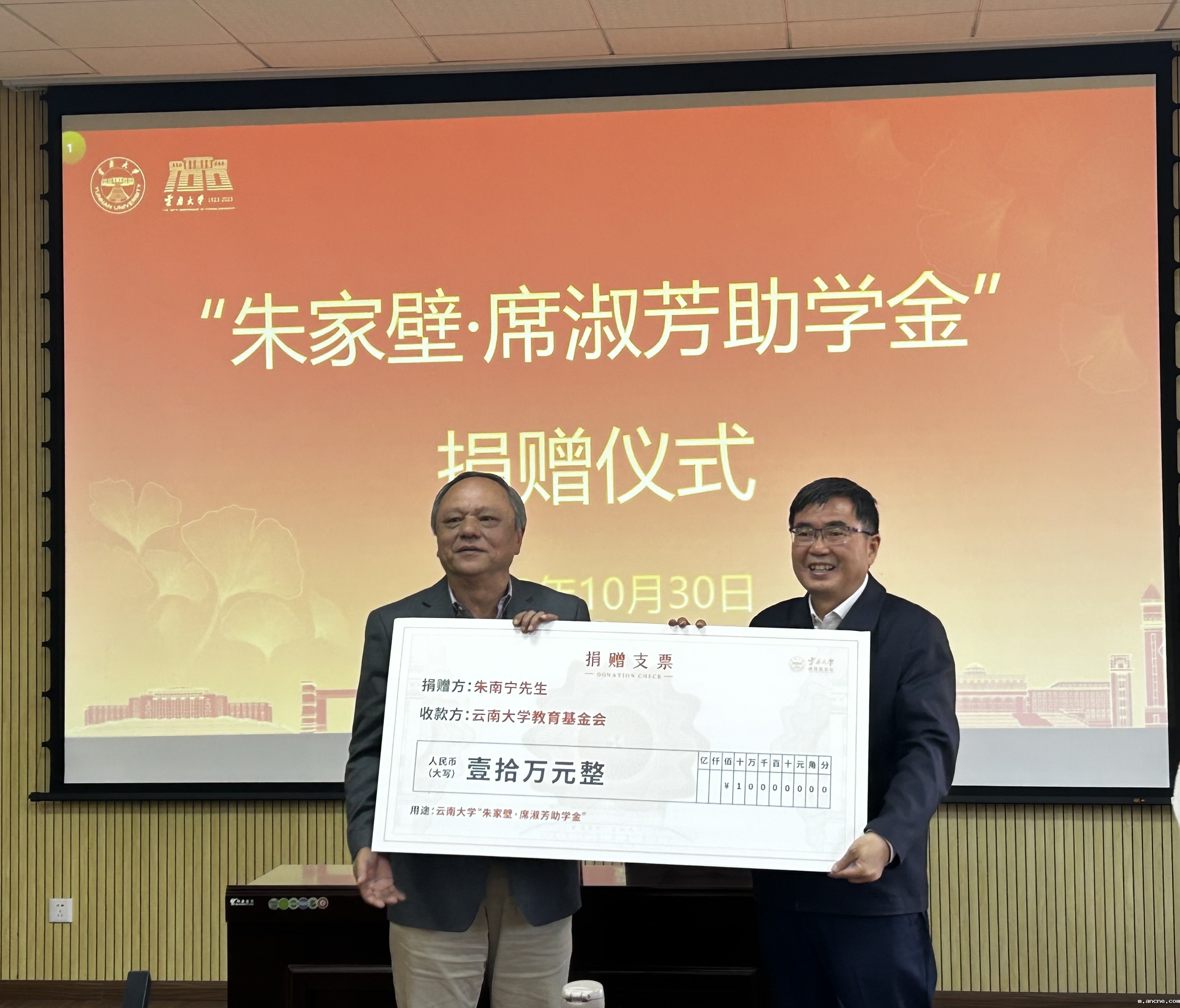 朱南宁向米兰国际官网捐赠,陈克清代表学校接受捐赠。朱南宁表示,希望受助同学珍惜校园时光,以优异成绩回报社会。“朱家壁∙席淑芳助学金”由朱南宁捐款设立,意在纪念其父亲朱家壁、母亲席淑芳,资助云大学子,延续其父母对云南、对云大的热爱。